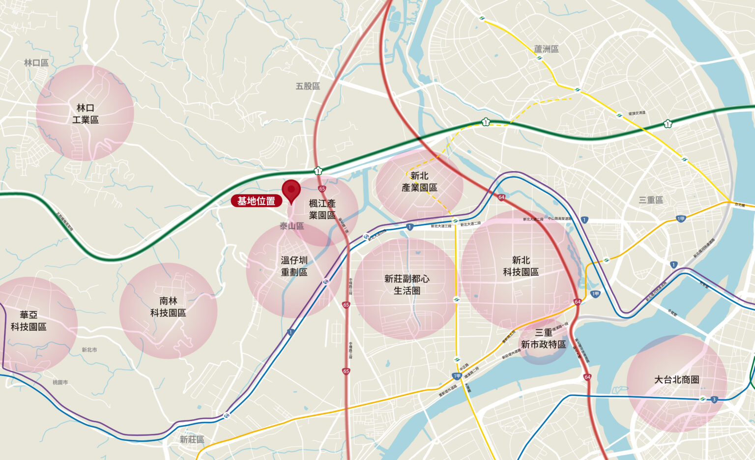 隨大台北產業鏈的快速擴展,五泰地區樞紐重鎮地位日益穩固。泰山區作為大台北都會區的重要位置,周邊產業聚落密集,包括五股、新莊、林口等工業區,形成穩固的產業鏈。區域內商圈資源豐富,為企業進駐創造理想的工作與生活環境。隨著新莊副都心、新北產業園區、新北科技園區、塭仔圳重劃區推進,北台灣最精華產業商務廠辦黃金地區,企業落棋佈局,方能掌控市場先機。